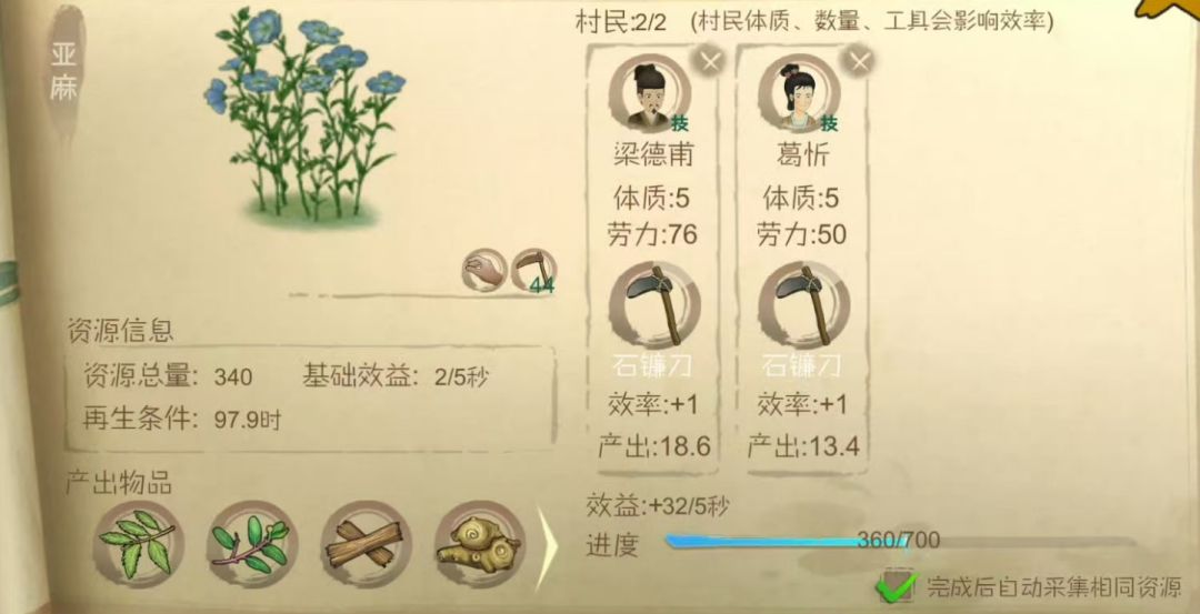 - 草本资源日(2个人一天采集6颗,8个人4类植物全部采集完成): 采集亚麻等作物速度极快,单份仅需约2分钟。这意味着在一个游戏日内,团队可以轻松完成多达 6份 的草本资源采集,实现爆发式产出。