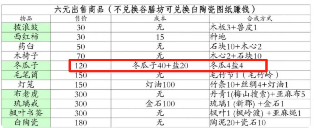 - 配方:冬瓜子=4冬瓜+2盐=60铜币