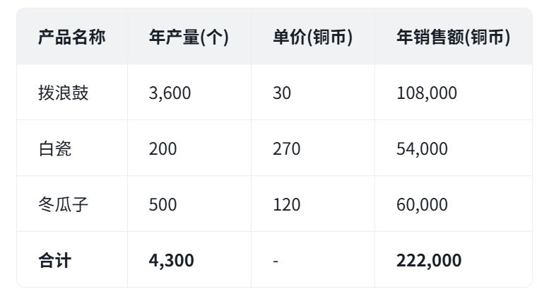 - 销售拨浪鼓=年产3600*30=108000铜币