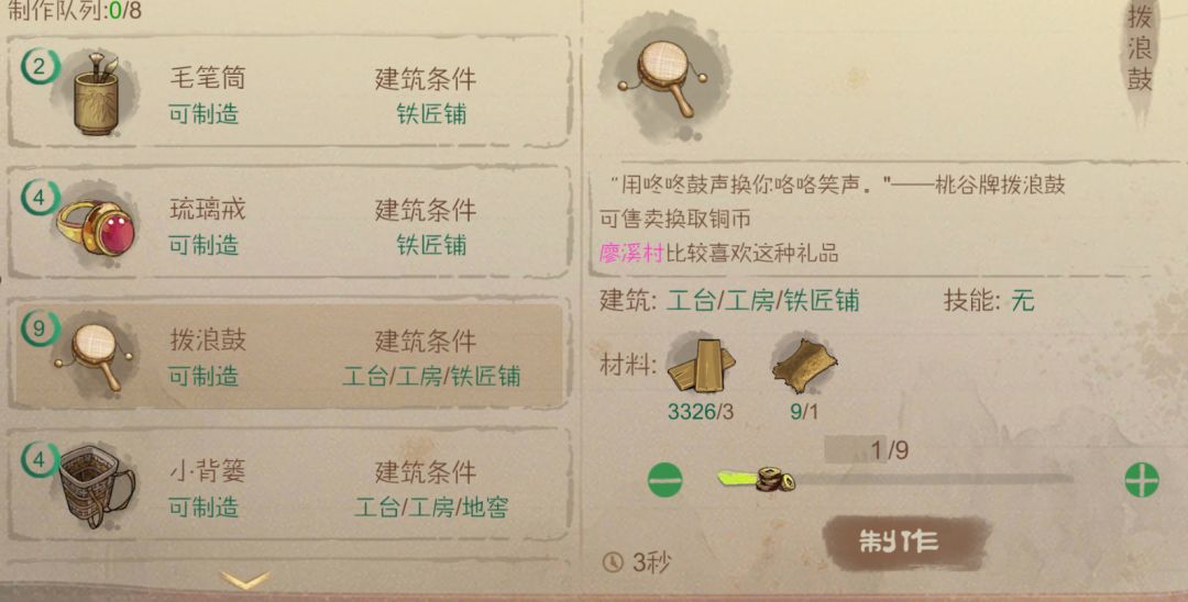 - 拨浪鼓=3木板+1兽皮