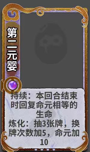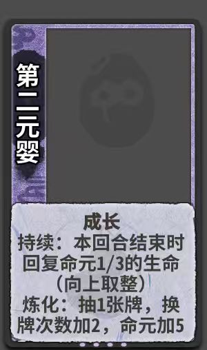 平衡和效果方面,一是虽然满级牌效果出众相当于拿到3修5d10命元,但一是作为机缘牌本身就具有相对较高的收益,二是有成长回合的限制。另外就算不练化,其本身效果也算优秀,配合命元达到强者通吃的效果(越强保留的命元就越多,回复效果越高),毕竟修仙小说中只有强者才会去修炼第二元婴。