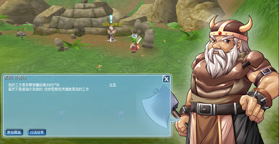 2. 接受巴克玛的两项委托: 前往狂风之谷狩猎食人魔,从其身上取回商团的文件; 深入狂风洞穴,狩猎侏儒怪并搜集50个“团员的名牌”。