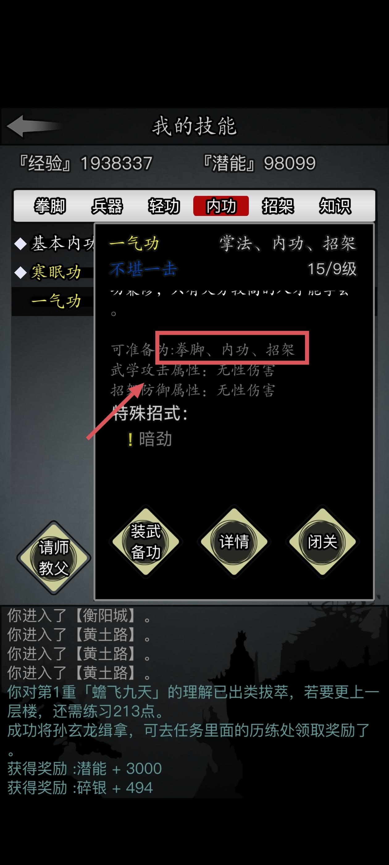 这里显示可以同时装备在拳脚,内功与招架上,这就是一拖三,举一反三,如果一个武学可以装拳脚,轻功,内功,招架,那它就是“一拖四”