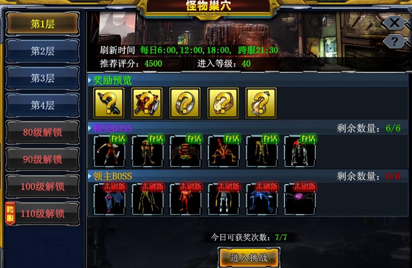 BOSS:怪物巢穴(6/12/18点固定刷)+野外BOSS,组队抢金装