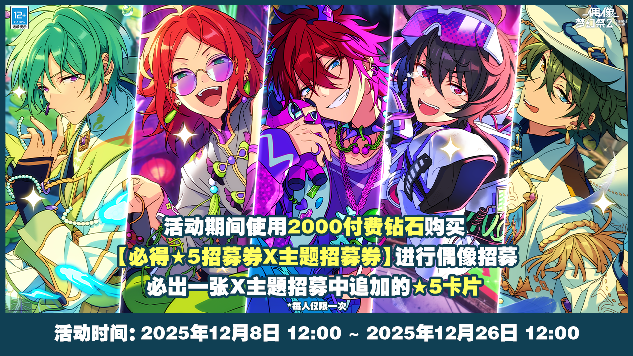 活动期间,使用2000付费钻石购买「必得★5招募券X主题招募券」进行偶像招募,必出一张X主题招募中追加的★5卡片,每人仅限一次。