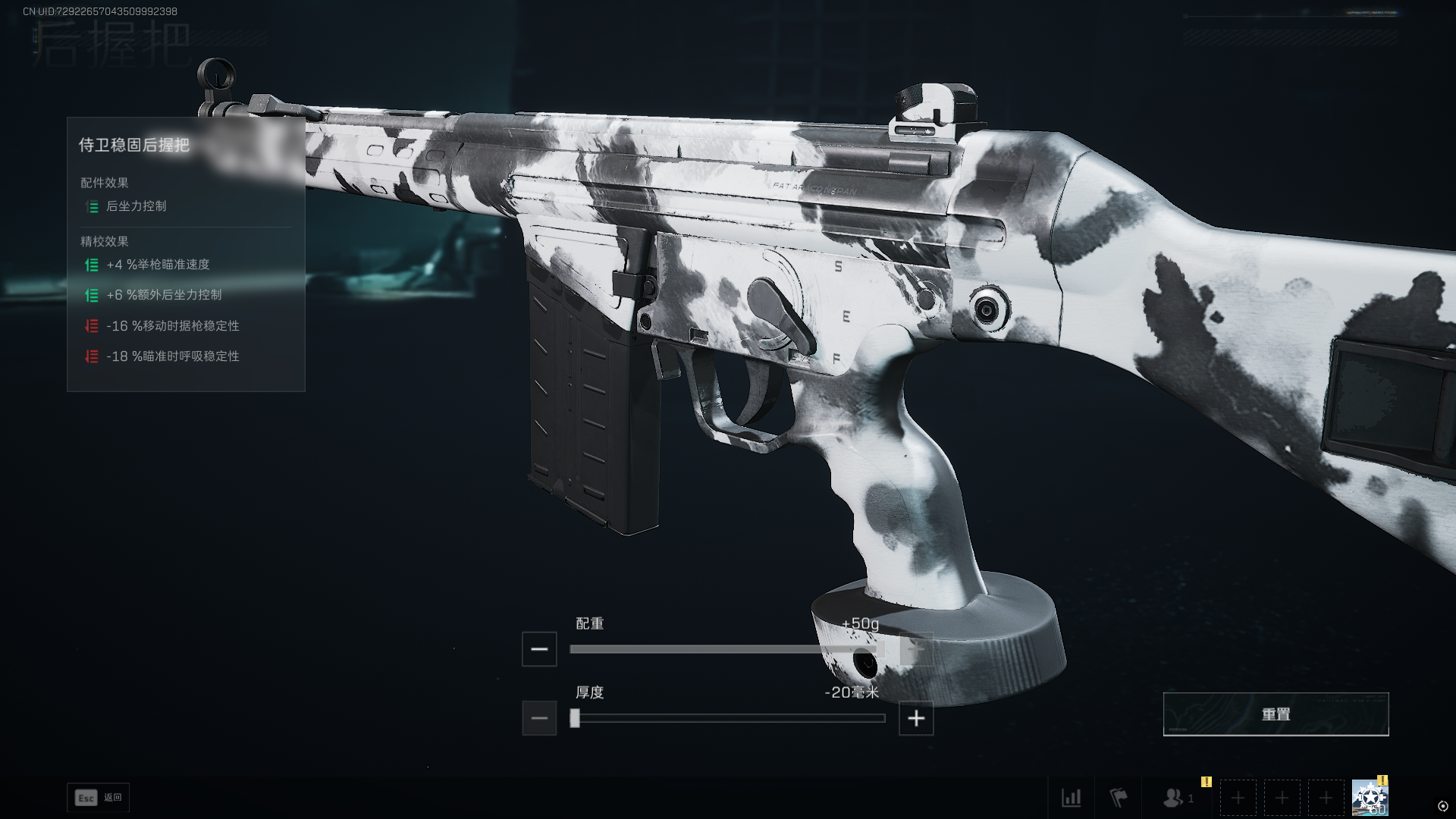 这里我们就要抬出【侍卫稳固后握把】握把的精校了,它可以进一步提升6%额外后坐力控制,同时也能进一步提升4%开镜瞄准速度,与此同时它本身还是一个无负面效果的配件。
