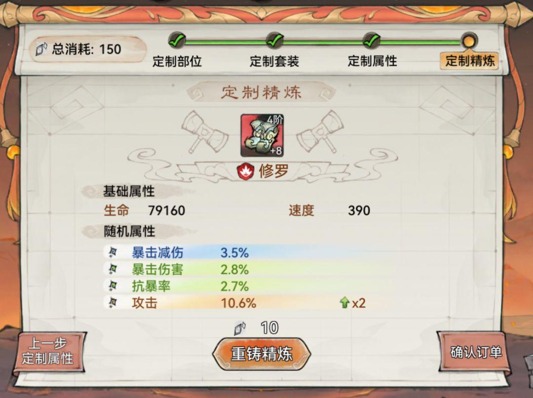 最后就是交尾款确认,注意在提交之前,都可以回到之前的任一步骤进行修改,而如果天银不够也不要担心,可以按左上方推出活动界面,等天银攒够了再点进来打造,刷出来的装备数据是不会重置的。