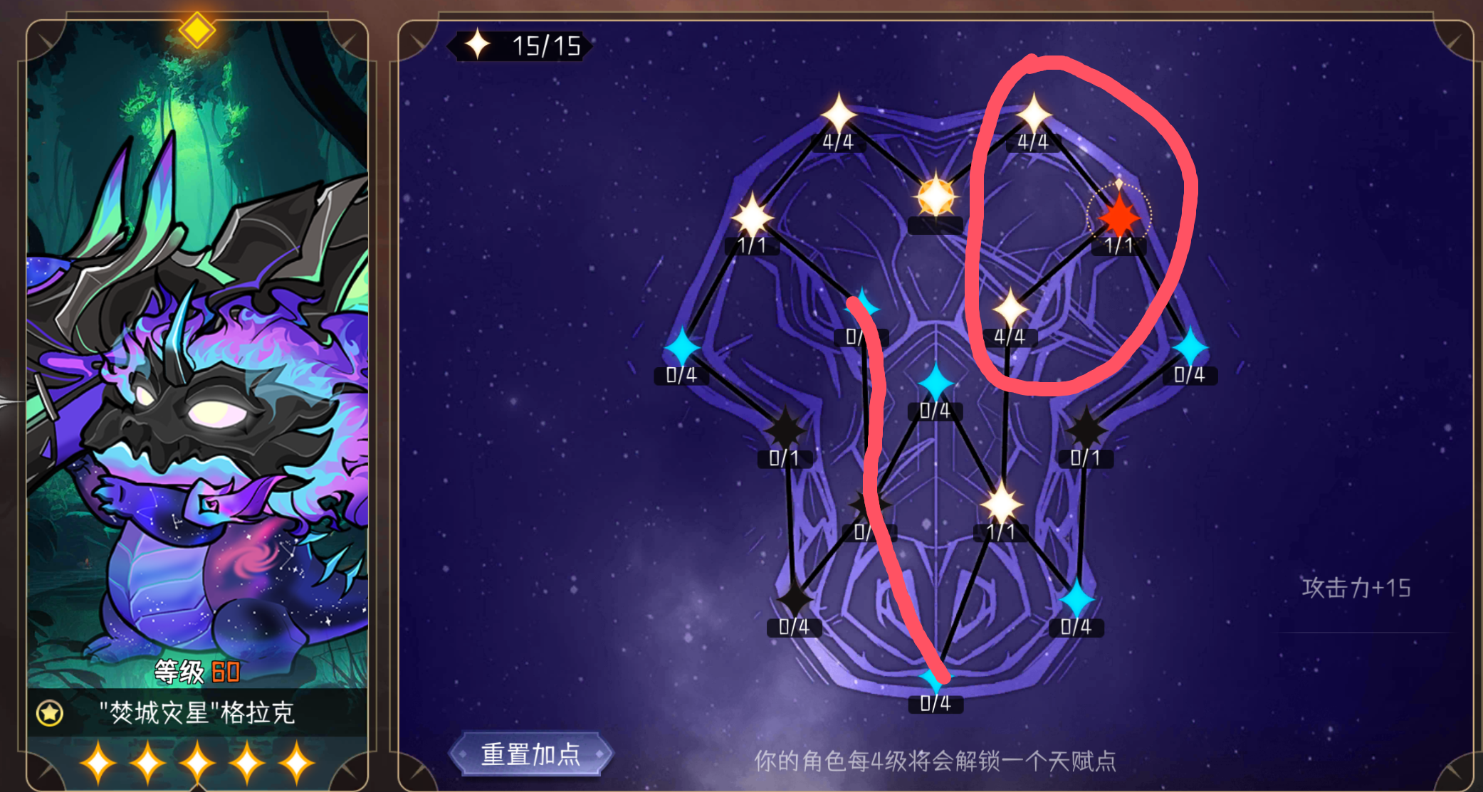 天赋有两套点法,走左边划线是14暴伤18暴击,走右边画圈是15攻击4所伤4命中。但二炮这东西吧,暴伤出奇的低,局外堆个350比较费劲,缺暴伤就点暴伤。