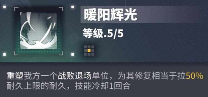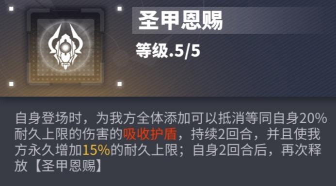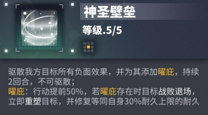 机神的核心主动技能,给单个队友套2回合的复活甲,驱散所有负面并且行动提前50%。