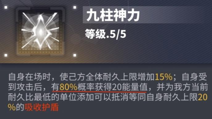 特性的主要效果是自身挨打有概率给np并且给个单体盾,一特性触发率是40%,三特性60%,满特性80%。护盾量和全队血上限其实影响都不算大,因为护盾只给单个目标,覆盖不了全队,总会有人扣血并且需要治疗的,血上限15%跟机神特性是加算,只是在开局多点血量优势,真正影响拉在高难本里的上限表现就在于获得能量值这一条,因为高压环境里有可能没位置带回能角色或者回能角色被迫放别的技能,导致队伍np紧缺,拉挨打能不能给队伍恢复np才是这个特性里最关键的效果。