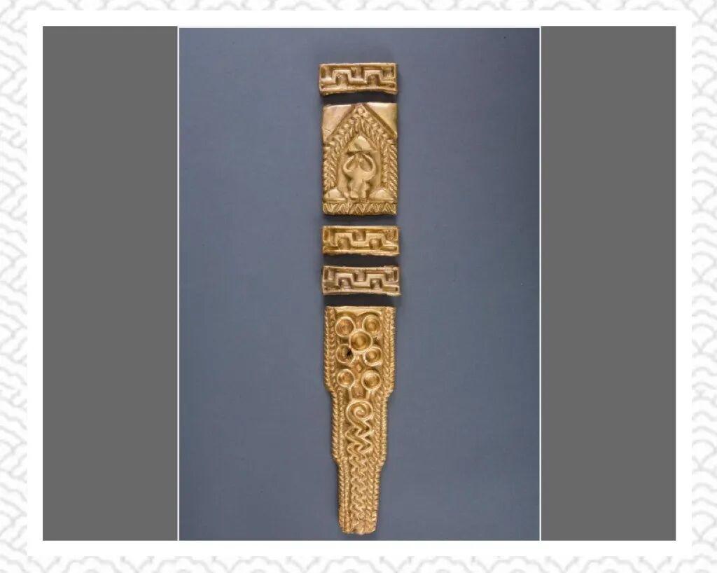 武将仪仗之魂。出土于晋宁石寨山汉墓,距今约2000年,恰是古滇国文明的鼎盛之时。鞘体以纯金锤揲而成,表面压印的牛头纹威严写实,双角弯曲尽显庄重,搭配连续菱形几何纹饰,尽显古滇工匠的精湛技艺。