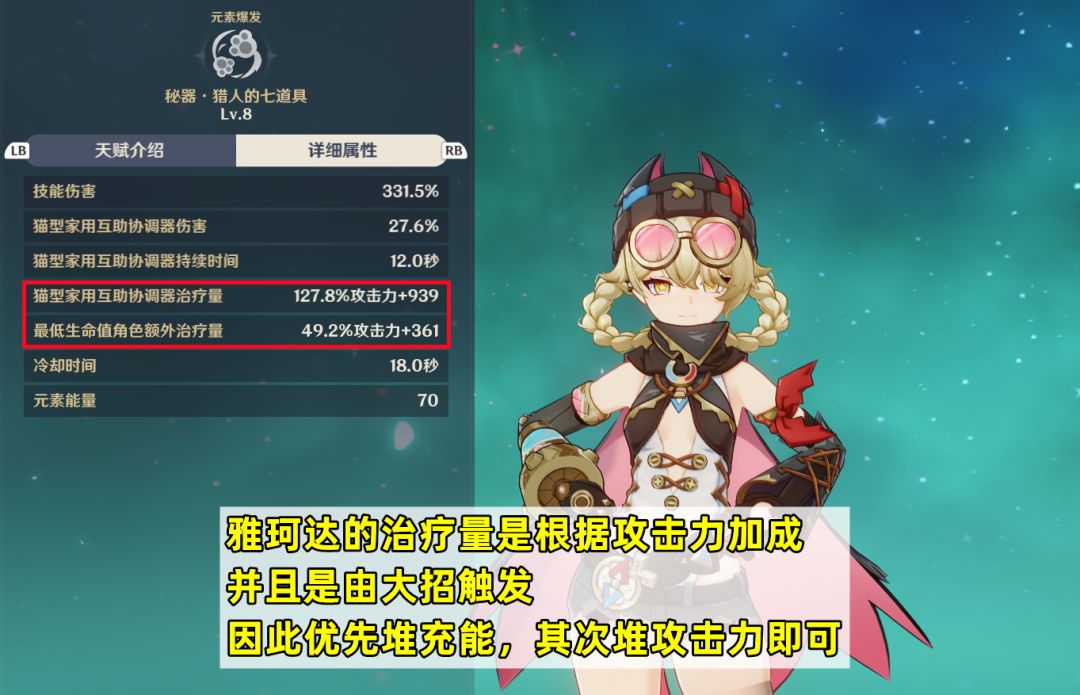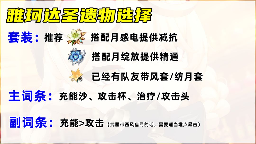 词条方面,因为雅珂达的治疗量是根据攻击力加成,并且是由大招触发,因此推荐优先堆充能保证大招循环,其次堆攻击力。主词条推荐:充能沙、攻击杯、治疗/攻击头;副词条推荐:充能>攻击,如果武器带西风猎弓的话,需要适当堆点暴击。