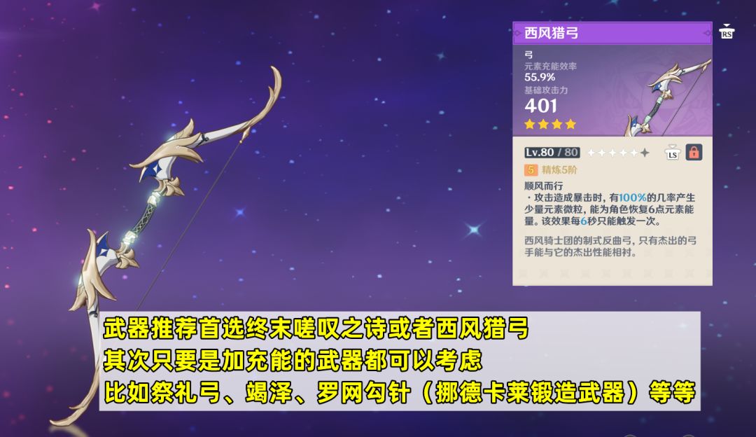 【武器选择】武器推荐优先考虑终末嗟叹之诗(给全队加精通和攻击力),或者西风猎弓(优化全队充能循环)提升辅助能力。其次只要是加充能的武器都可以考虑,比如祭礼弓、竭泽、罗网勾针(挪德卡莱锻造武器)等等。