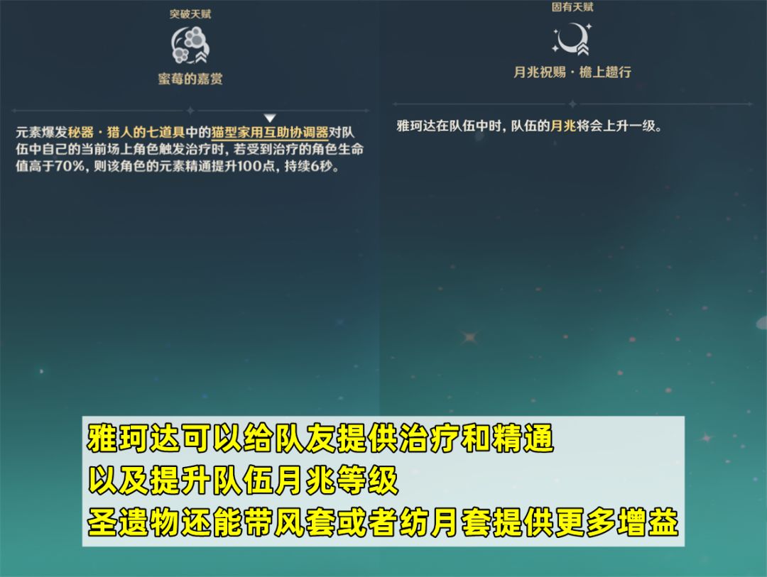 【配队思路】因为雅珂达可以提供精通、治疗和月兆等级加成,并且圣遗物还能带风套或者纺月套,因此很适合作为月反应队伍里的辅助+生存位。推荐的配队思路主要分两种: