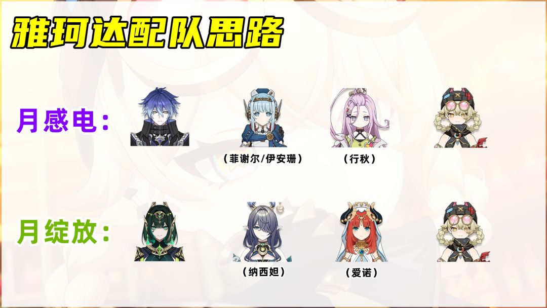月感电:菲林斯+伊涅芙/菲谢尔/伊安珊+爱诺/行秋+雅珂达月绽放:奈芙尔+菈乌玛/纳西妲+妮露/爱诺+雅珂达