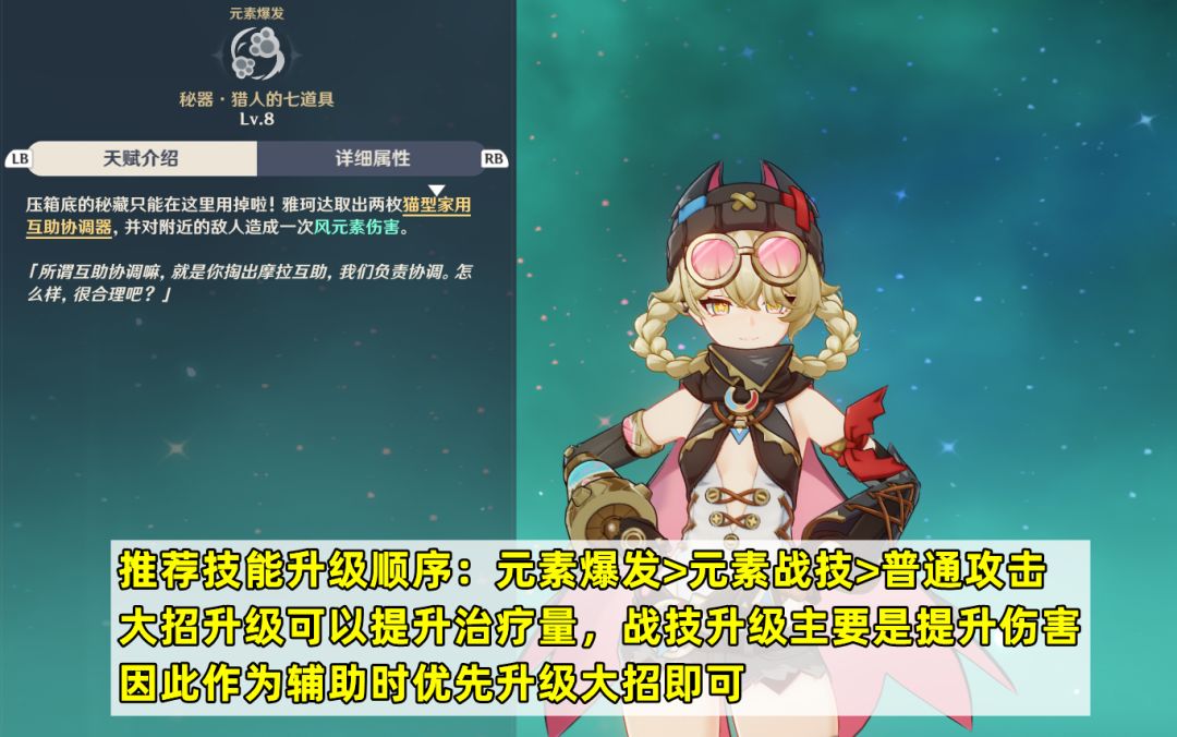 【技能升级建议】推荐技能升级顺序:元素爆发>元素战技>普通攻击。雅珂达的大招升级可以提升治疗量,而战技升级主要是提升对应的伤害,因此作为辅助时优先升级大招即可。