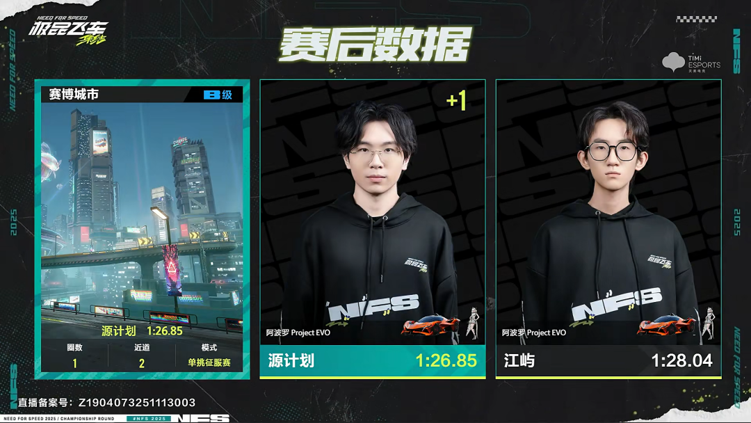 开局伊始江屿就和源计划展开激烈对抗,源计划凭借老练的操作强势超车想要冲击第一,但新人小将Kairy全程稳定领跑,以精准预判筑起防线,冷静化解多次进攻,最终强势拿下第一局比赛胜利。