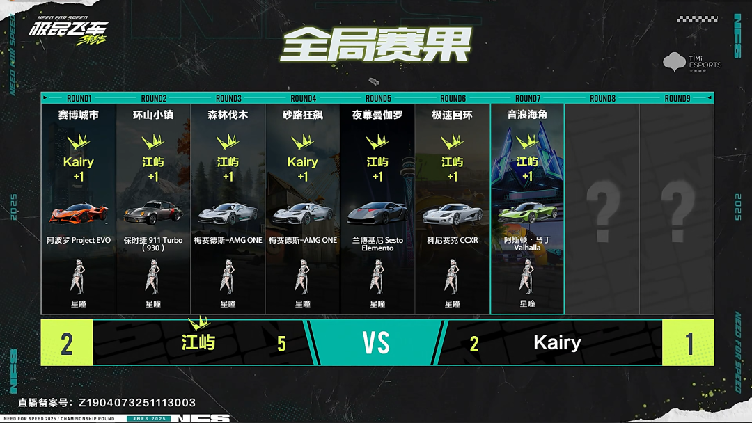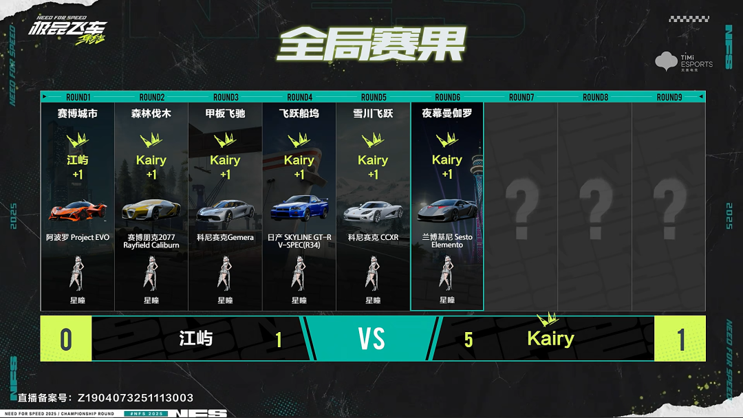 此后Kairy手感愈发火热,在雪川飞跃中以非常极限的贴弯操作掌控比赛,让一追五,最终气势如虹地拿下第一大局。