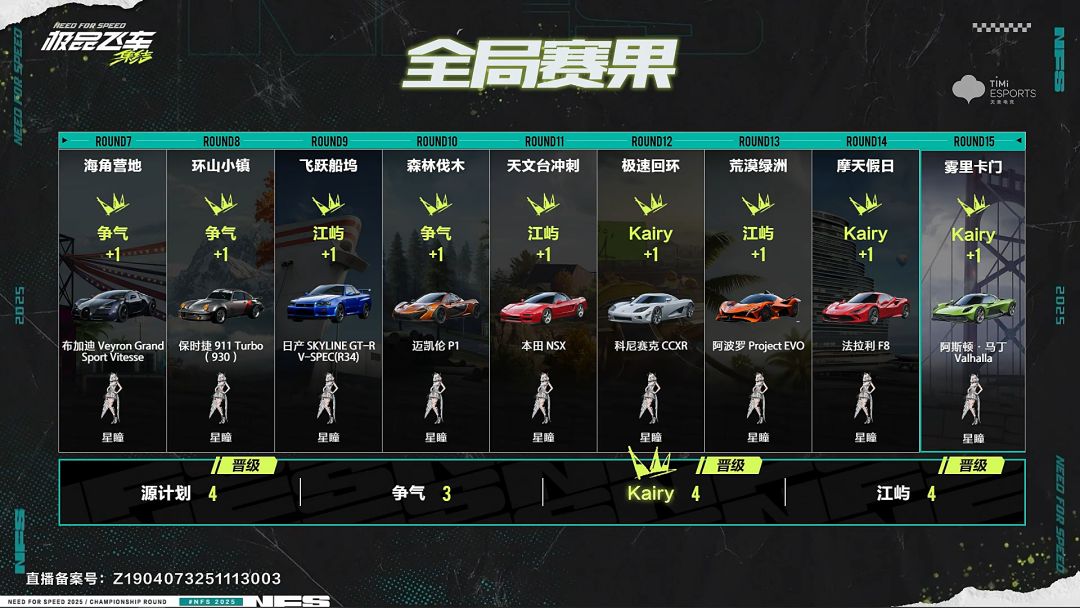 在摩天假日的激战中,Kairy与老将争气展开贴身缠斗,两人几乎同时冲线,Kairy惊险取胜,将比赛拖入赛点局。随后的雾里卡门赛道上,争气全程都在与Kairy积极对抗,却最终棋差一招遗憾落败,Kairy成功突围。