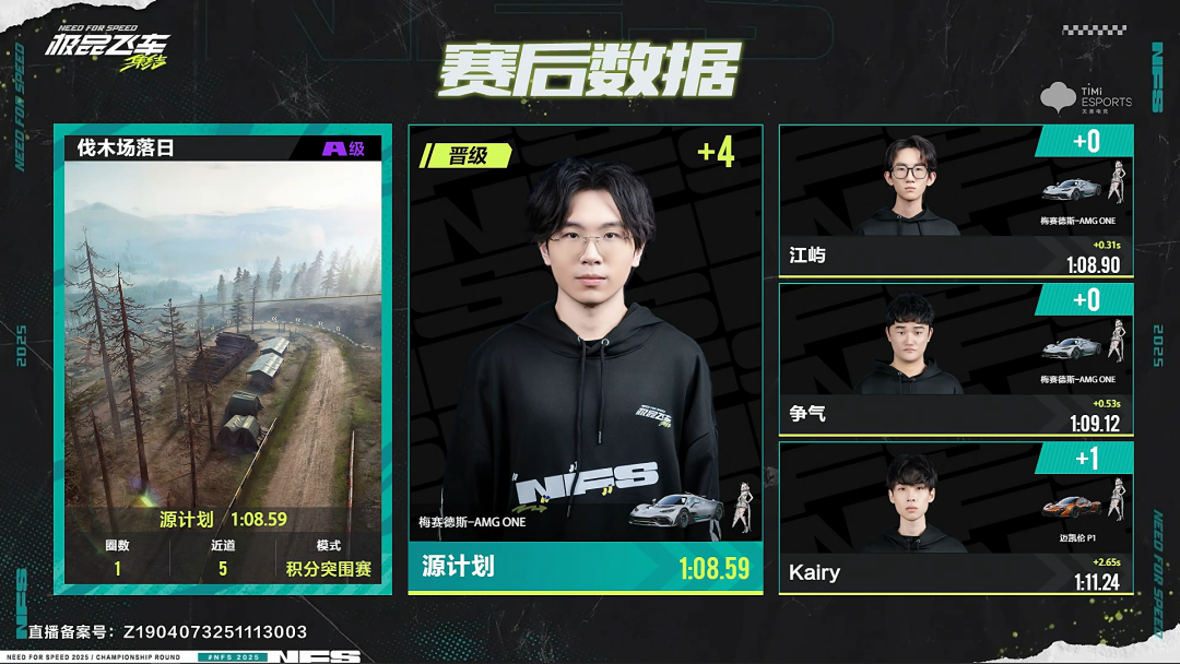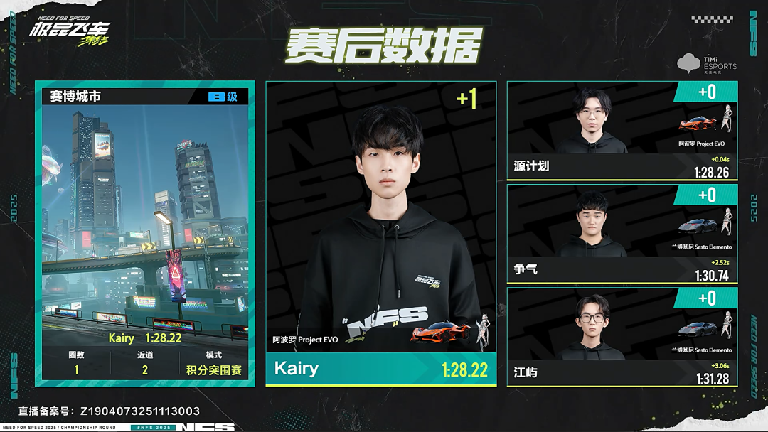 首战在四冠车神源计划、极速新星Kairy、砺刃老将争气与御风车手江屿之间激烈打响。