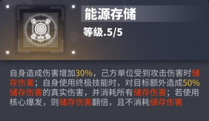 根据特性等级,大招会打出储存伤害的10/20/30/40/50%,例如储存了10w伤害,那么大招会打出1/2/3/4/5w真伤,并且消耗所有储存伤害,需要重新积攒。如果使用od则上面这部分的真伤会翻倍并且不消耗储存伤害。