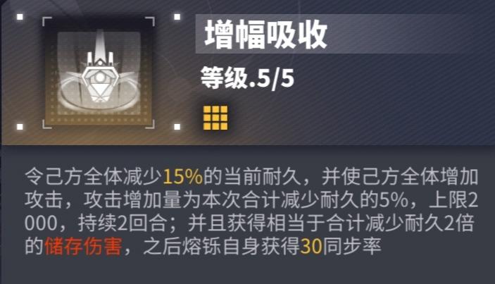 辅助熔铄的核心技能,能主动消耗全队血量并且计入储存伤害,并且增加同步率方便后续打出od。