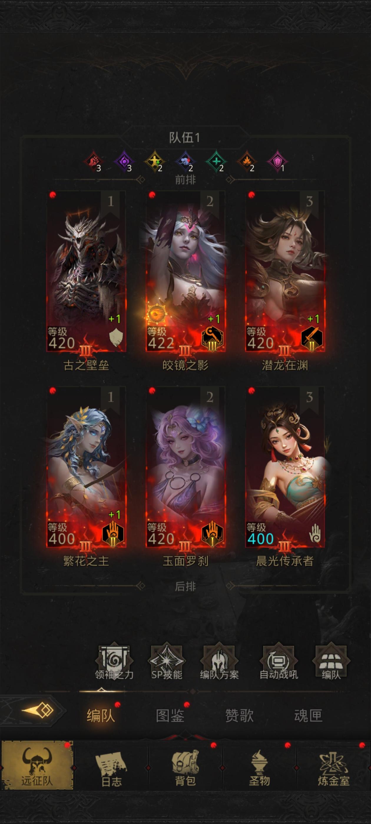 后面就无光之地的兽潮3波怪难打一点。我是火队。暗队也可以这样。上双奶。站位如图。晨光也带减抗。开局三波怪都是打最右边那个。那个给所有加抗性加60%的。这样的话容错率高法师带装备也好带。3波怪有些人能抗住但时间不够。打法思路集火秒最右边的那一个打完之后其余的三个不用一个一个打死。随便一个把它打到胜5-7千万。再打另一个。不要浪费战吼。基本上打死最后一个另外两个都刮死了。