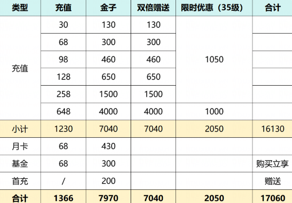 双倍拉满一共1230元(30+68+98+128+258+648),获得金子7040个+赠送7040个+首充200个,一共16330个;