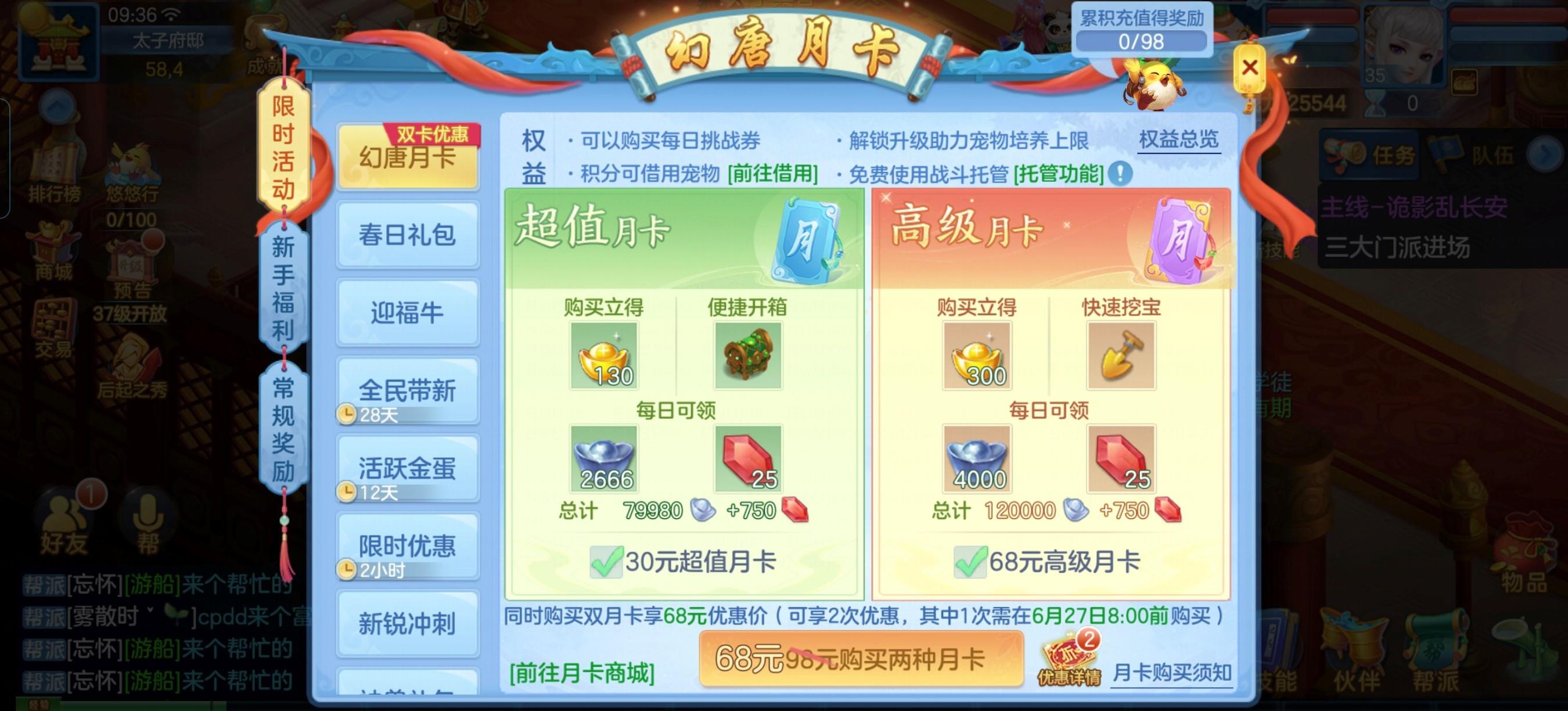 前期双月卡有折扣,只要68元,赠送金子430个;
