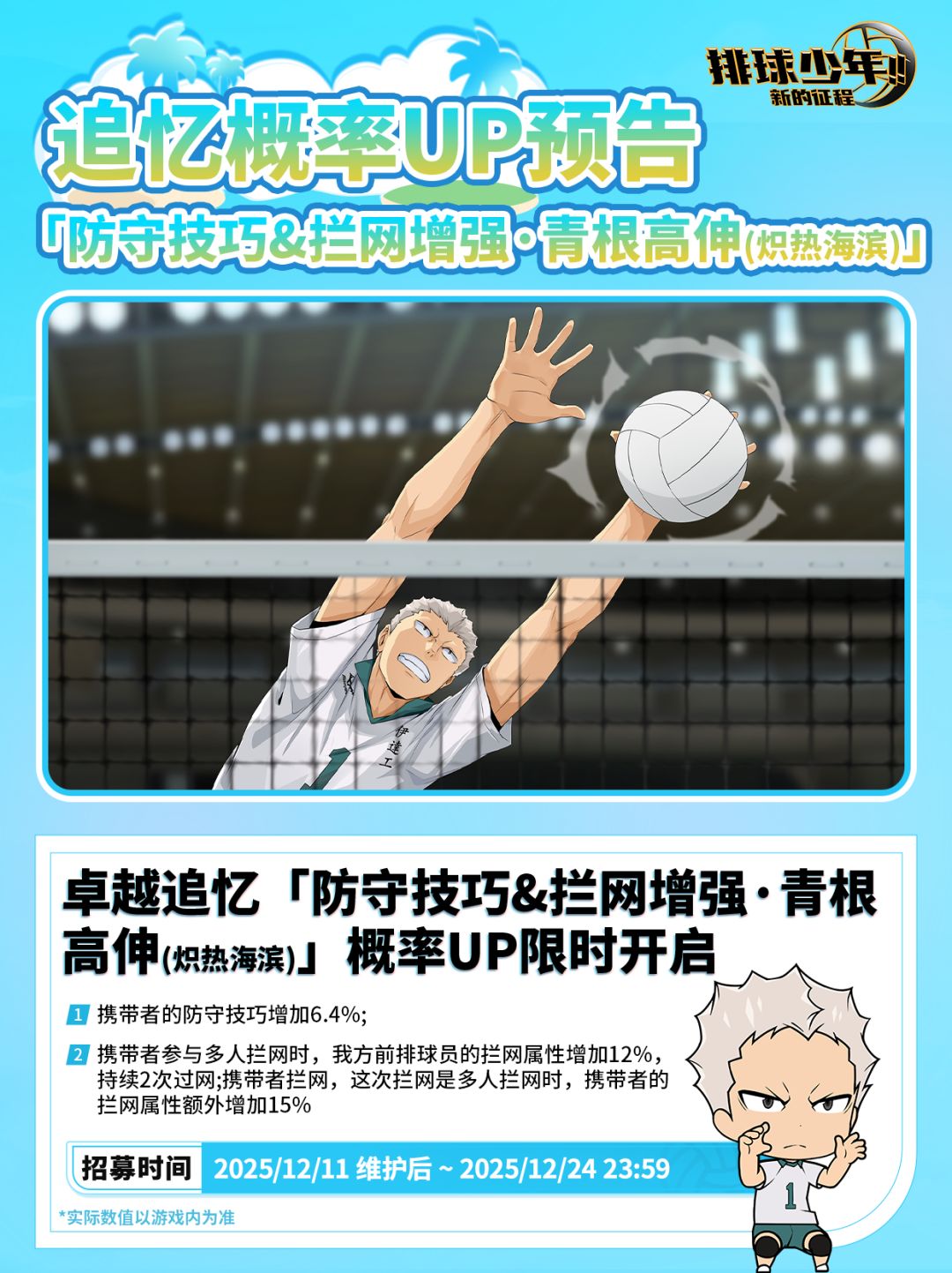 🏐卓越追忆招募限时开启:「防守技巧&拦网增强・青根高伸(炽热海滨)」。