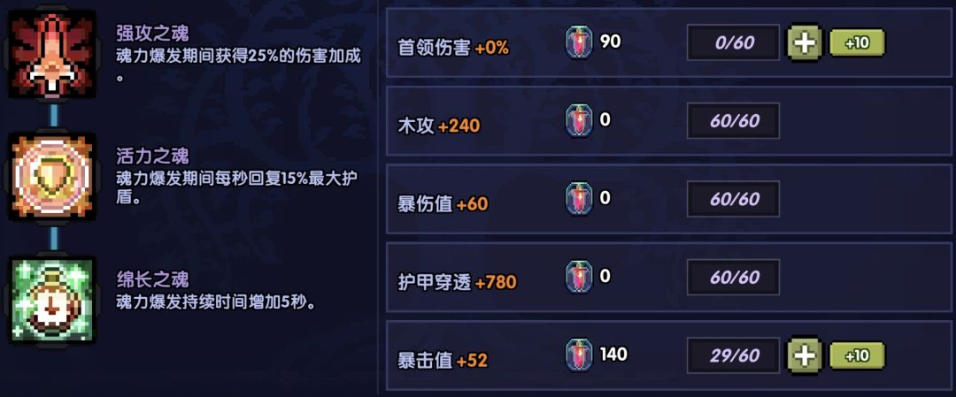【魂力属性】优先点满木攻、暴伤值,护甲穿透、暴击值可以根据面板来加点。