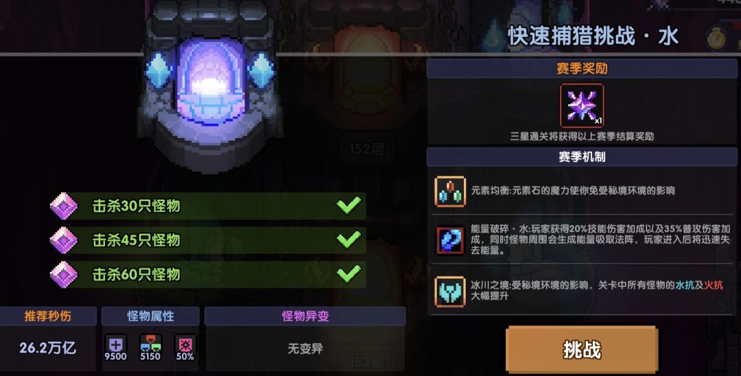 【关卡buff】:能量破碎·水:玩家获得20%技能伤害加成以及35%普攻伤害加成,同时怪物周围会生成能量吸取法阵,玩家进入后将迅速丢失能量。