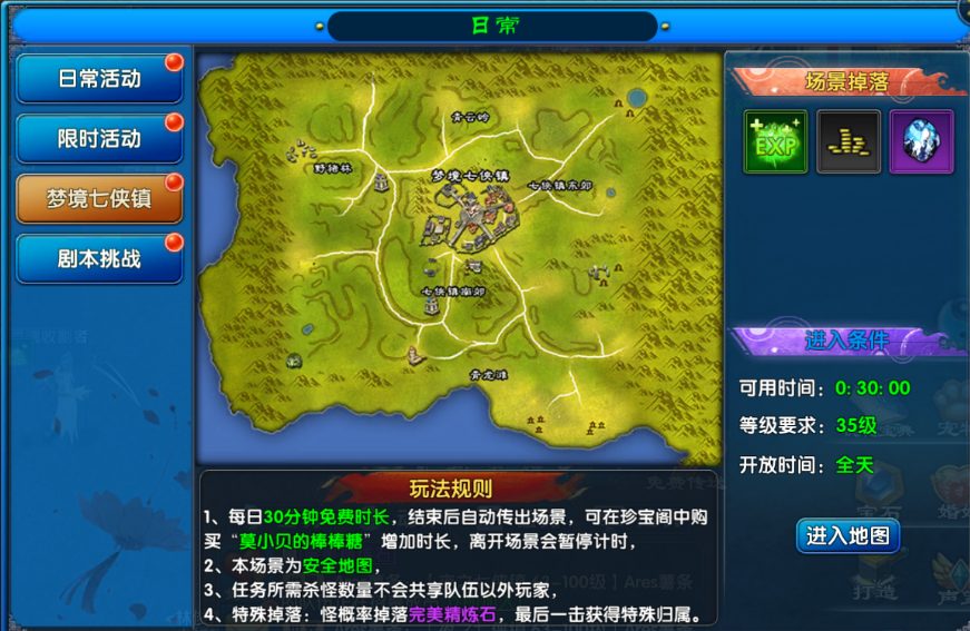 梦境七侠镇(30级解锁):每日免费30分钟,可使用“莫小贝棒棒糖”延长时间,重点收集完美精炼石。
