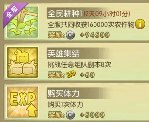 银币获得数量:中量银币获得难度:一般是否花费元宝:日常任务中所有任务都可以免费完成,也可以花费20元宝/任务直接完成是否渠道稳定:任务每日刷新是否额外加成:暂无其他途径加成任务获得的银币其他额外影响:全民耕种任务计算的是全服所有玩家种植次数,需要大家合力完成,若当前服务器人数少或者种植次数不够,会导致无法完成任务获得银币