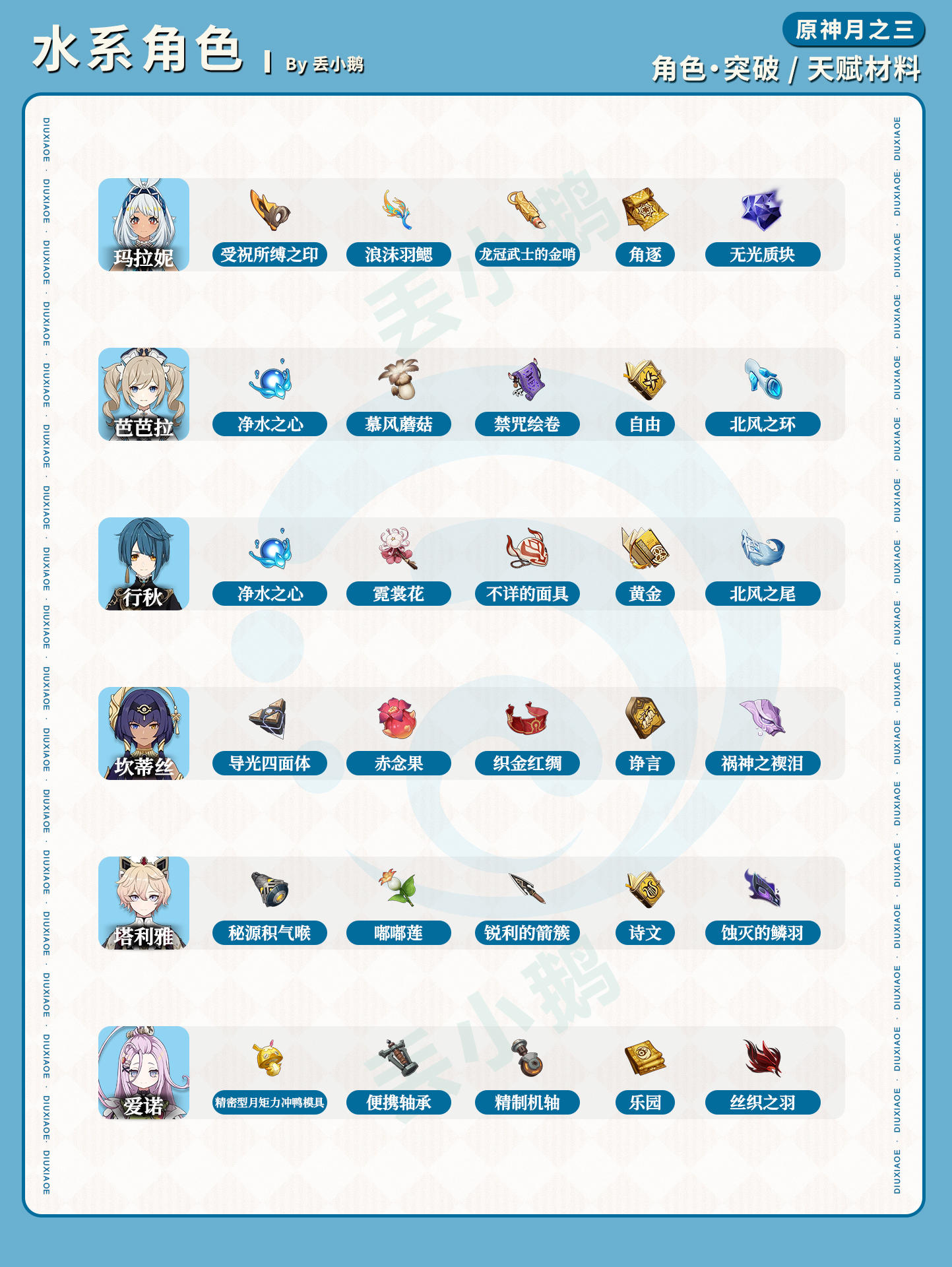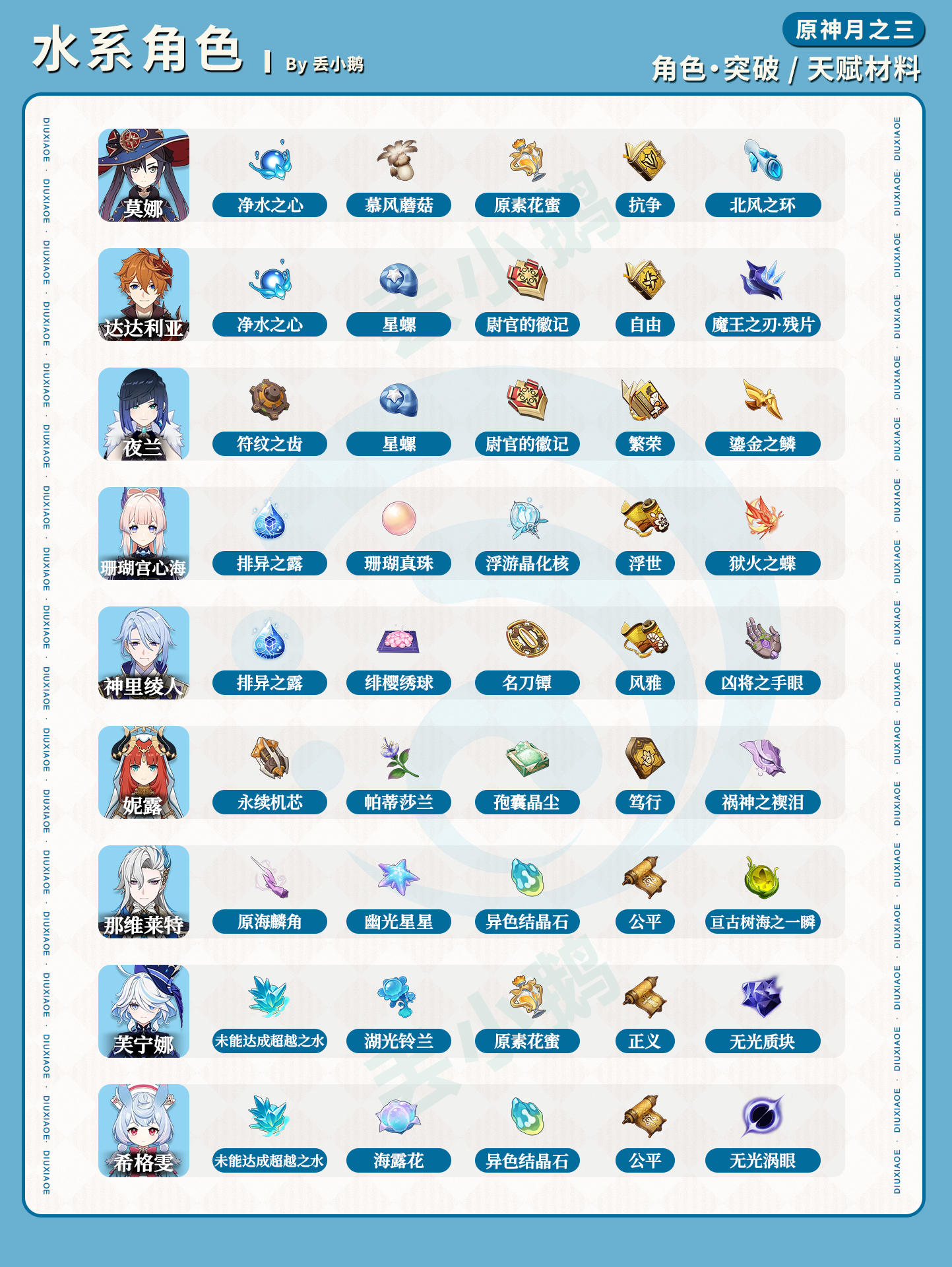 我是丢小鹅,为你带来【原神月之三】全角色突破/天赋材料一览表。