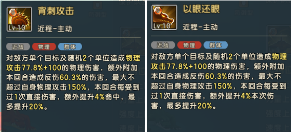 技能附带本回合反伤60%伤害,两套技能差别,一个是增加伤害,另一个增加命中;