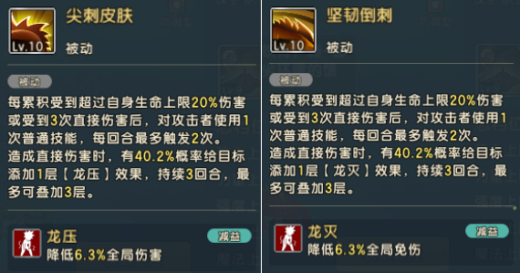 另外就是添加的debuff作用不一样,龙压是降低对方6.3%全局伤害,龙灭是降低对方6.3%的全局免伤;