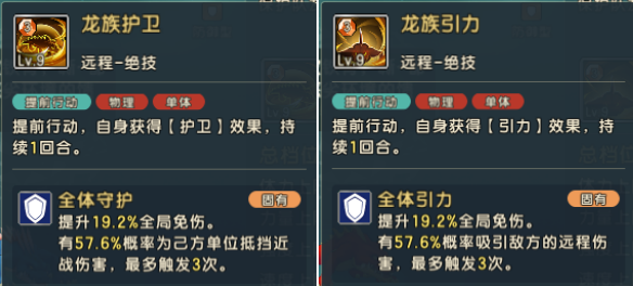 两套技能组的不同之处是:硬化龙鳞为从战斗开局到结束都是生效的,67%概率降低24.9%伤害;而龙族血脉则是血量低于67%时才触发的固有buff,固定提升18%的全局免伤;