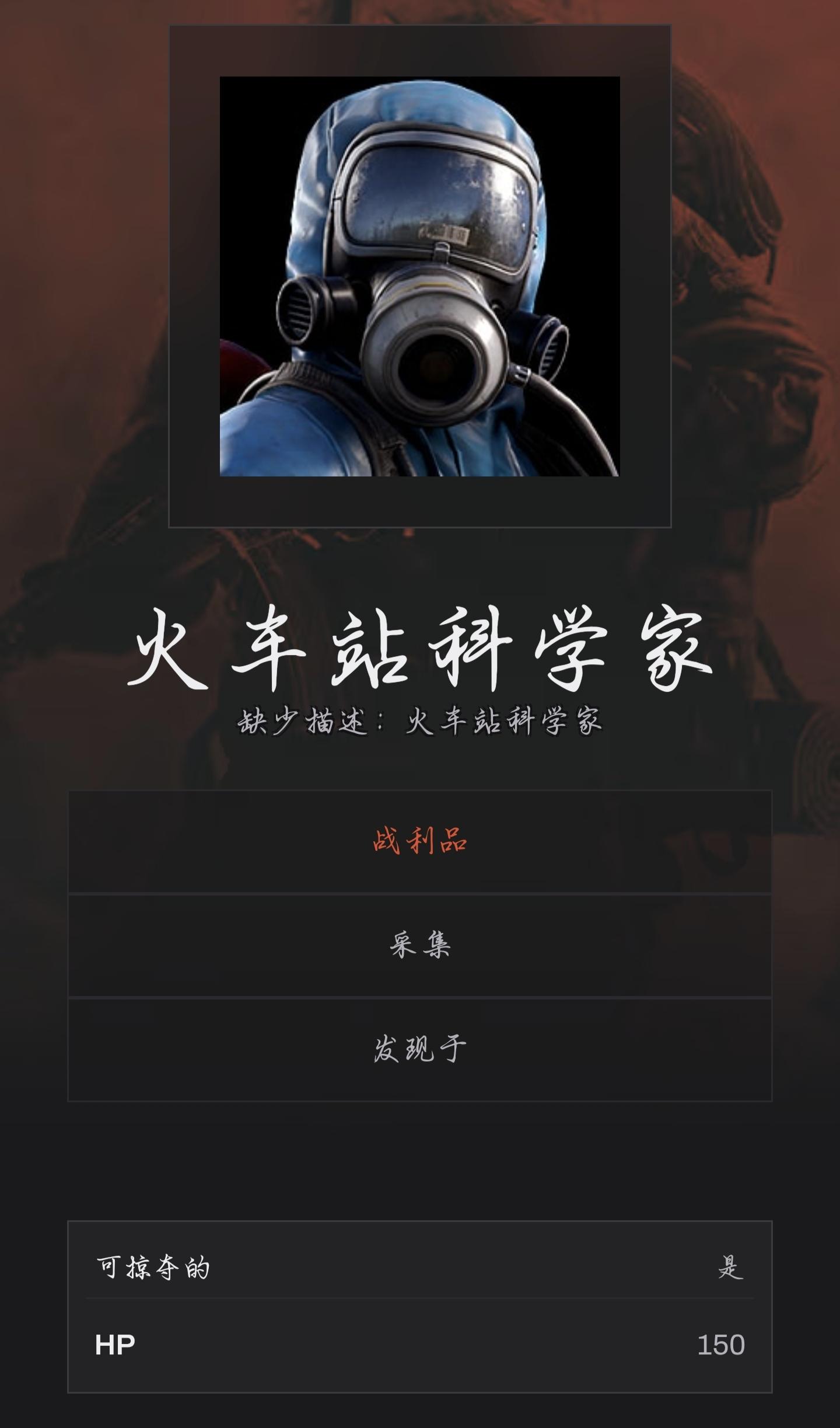 火车站科学家即是手持mp5或者LR-300的科学家,相对手枪科学家而言,伤害更高,血条更厚,只会在高级物资点刷新,比如火箭发射基地,军事隧道,油井平台,在处理掉这些科学家后,除了会有概率掉落手枪科学家的所有物资还会额外掉落武器手枪、双管霰弹枪、泵动式霰弹枪(普通);MP5、LR-300、M249(重型)。装备:金属护甲、咖啡罐头盔、金属面具(普通);重型防弹衣、防暴头盔(重型)。