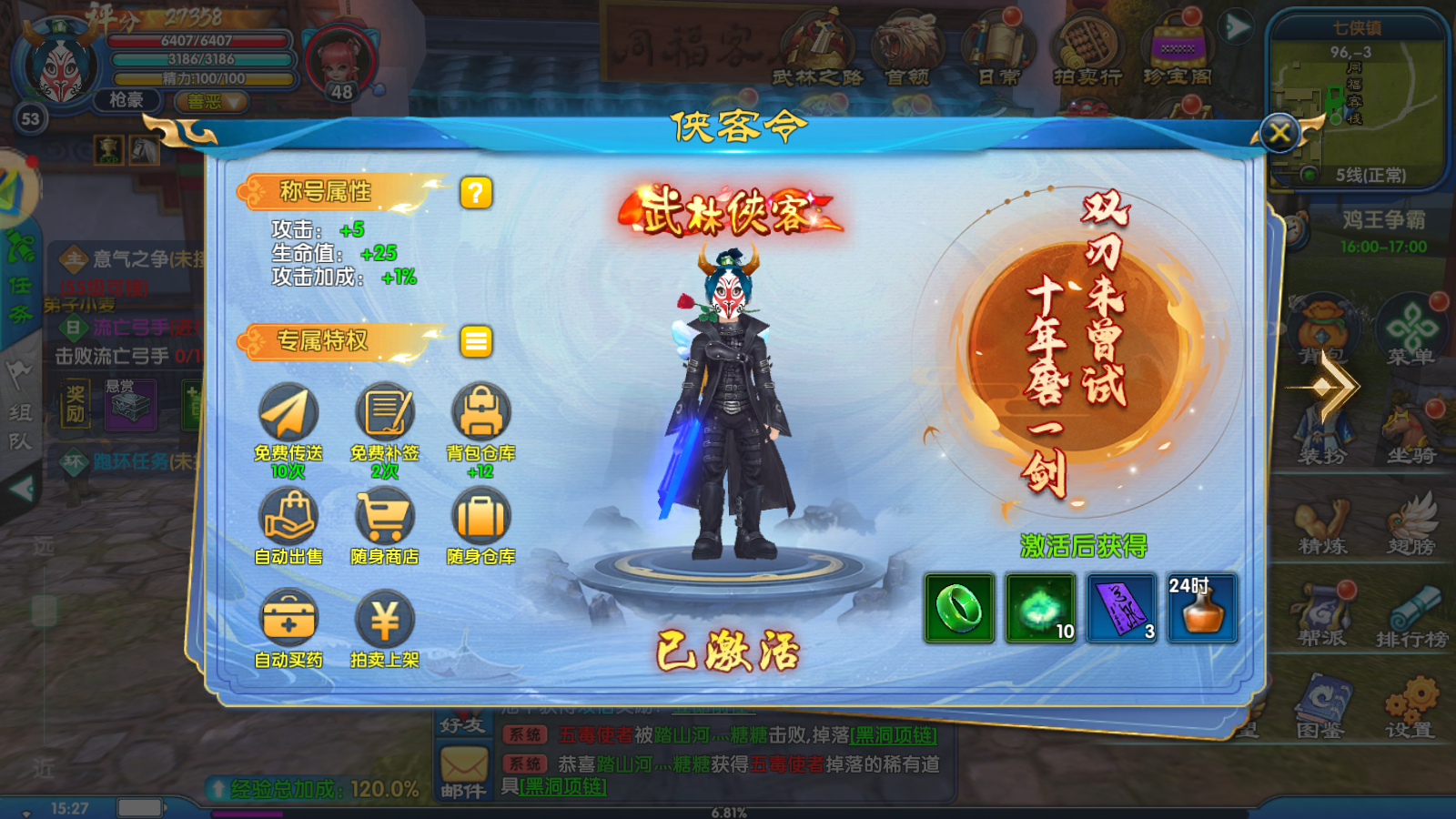 - 激活「侠客令」解锁随身仓库、自动买药,养成效率再升级。