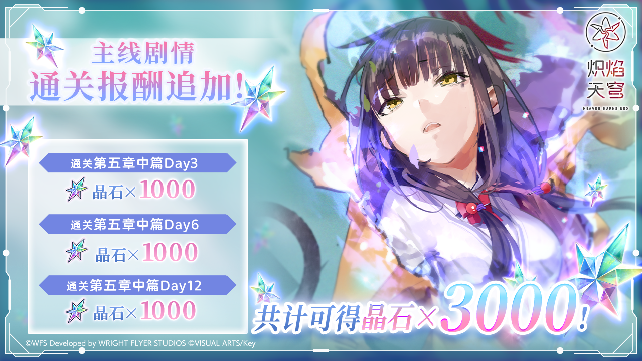 同时也将追加主线剧情报酬,通关主线剧情第五章中篇Day3、Day6、Day12可以各获得「晶石×1000」,共计可以获得「晶石×3000」!