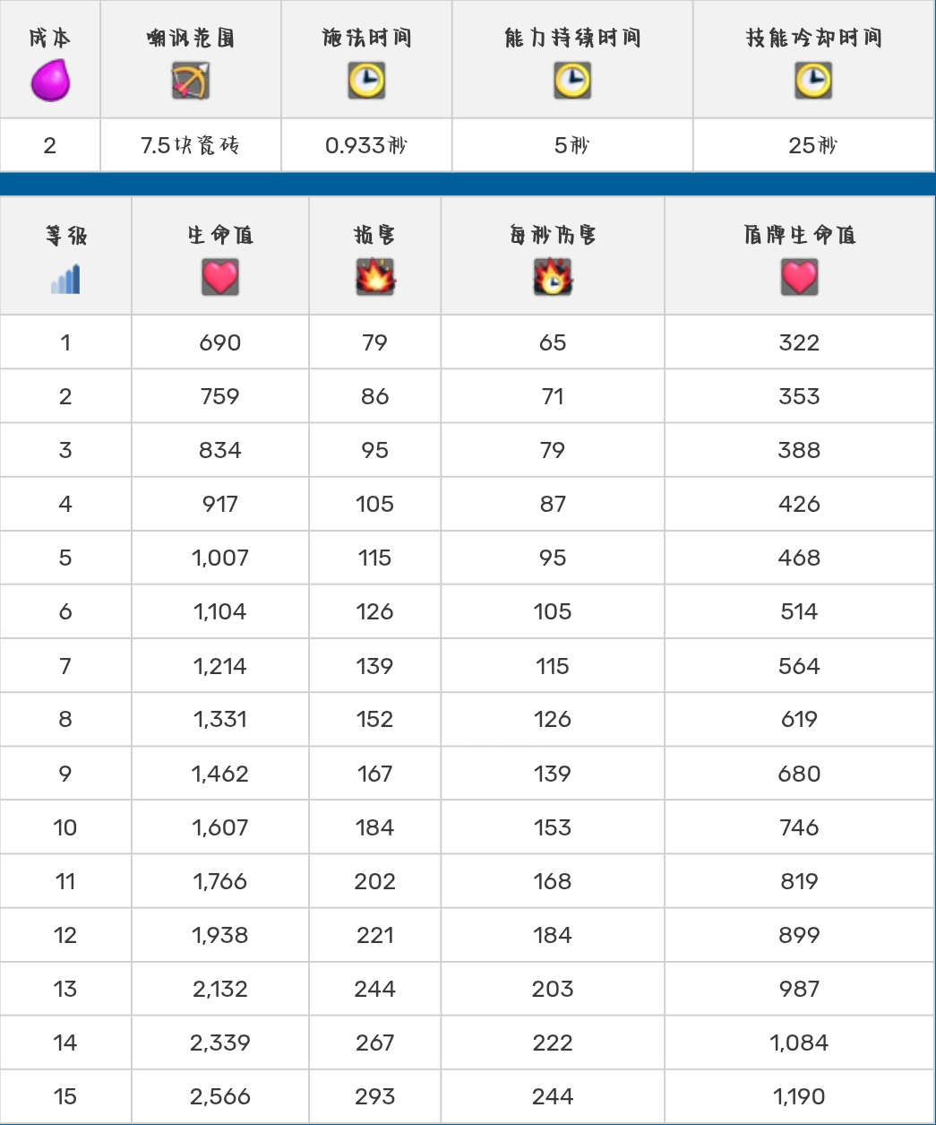 英雄火枪手特殊技能,使用技能延迟1秒后,英雄火枪手会激活她的“可靠炮塔”,在火枪手前方3格放置一座炮塔。该炮塔既可以分散敌方普通部队的注意力,也可以作为吸引胜利条件的建筑。炮塔的持续时间为10秒,这意味着它需要根据情况灵活使用,因为它的持续时间并不长,除非在衰败结束前被摧毁。技能持续时间结束后,会进入22秒的冷却时间。激活“可靠炮塔”需要消耗3点圣水。