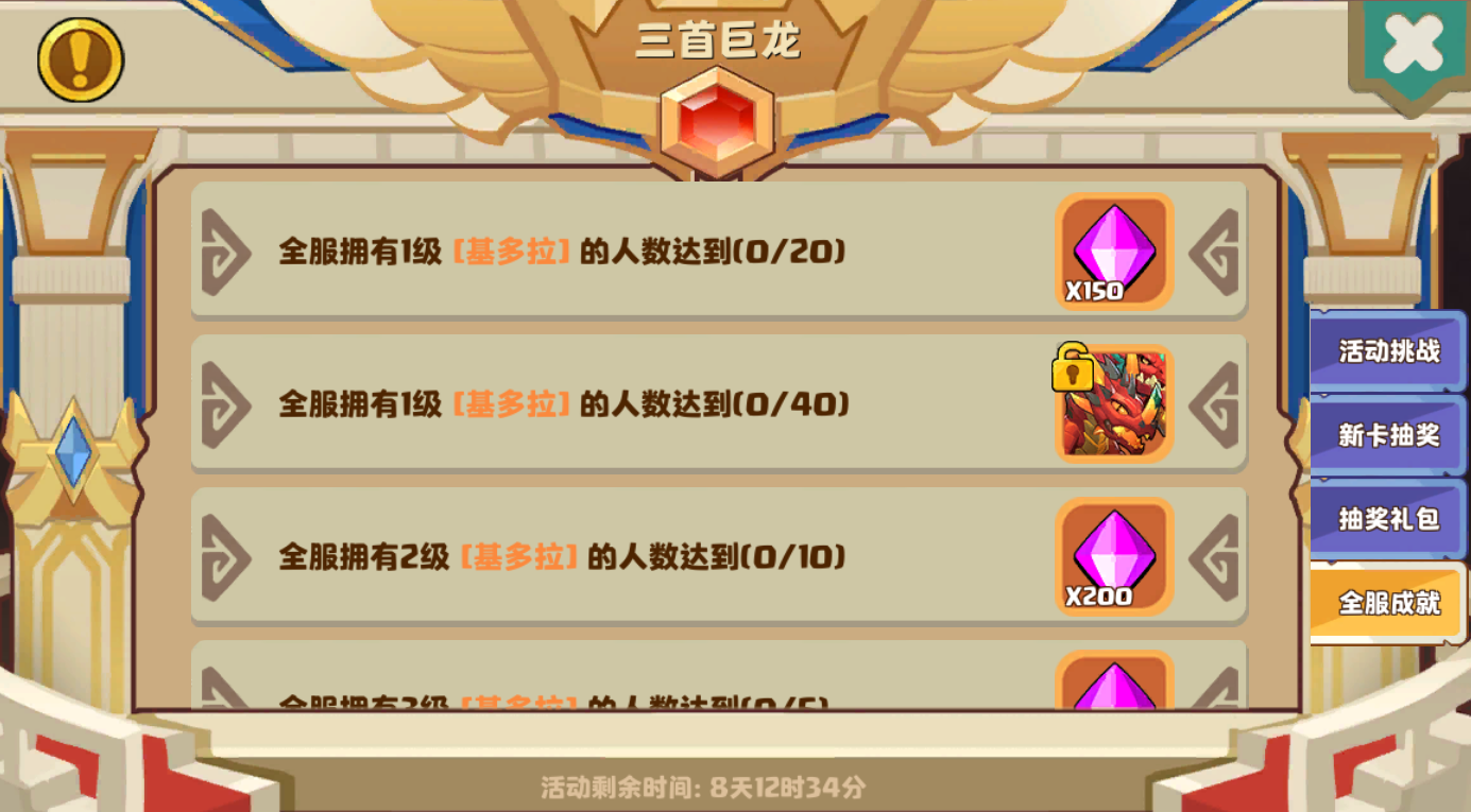 这是一个全服玩家一起共同完成的活动,当拥有基多拉的玩家达到一定数量时,全服玩家都可获得对应奖励,其中也包含全新金卡--基多拉!!!大家一起努力完成吧~