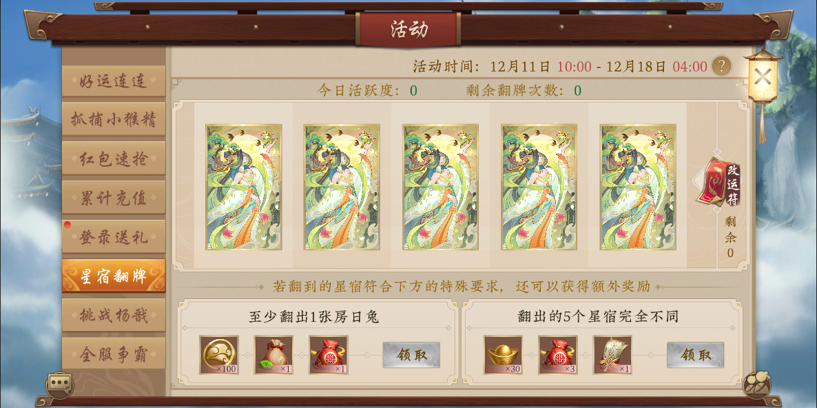 活动期间,玩家每获得30点活跃度,便可获得1次翻牌机会,每日上限5次。每翻一张牌会消耗1次翻牌机会。