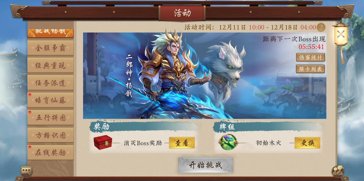 活动期间,世界Boss二郎神·杨戬将于每日21:00来袭!击败二郎神,全服玩家将获得丰厚奖励!