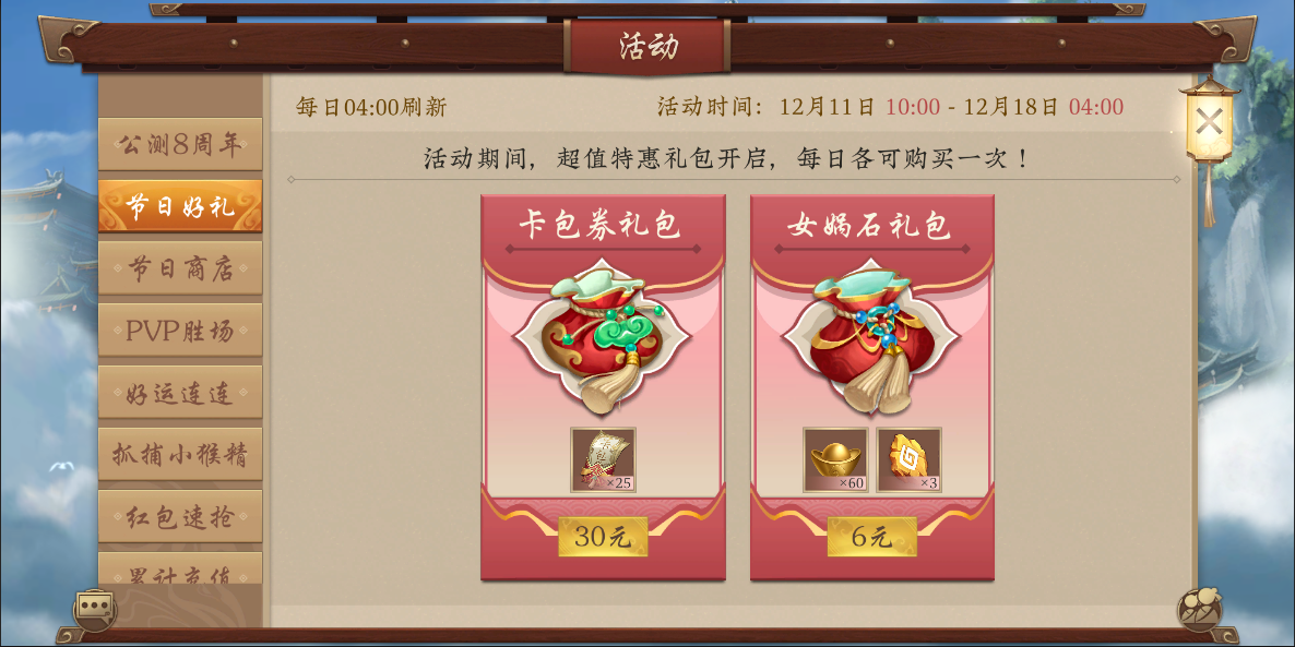 活动期间,超值特惠礼包限时开启,每日都可购买一次!
