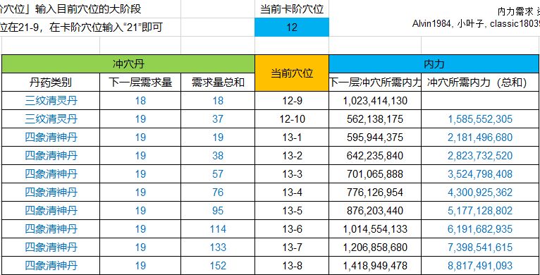 上图为江湖小数据的计算截图,可以看到,当玩家内力处于12-9时,突破所需内力为10.23e,而从12-10突破到13-1时所需内力为5.62e,一直到13-7突破到13-8时,所需内力才超过12-9之时突破所需的内力。