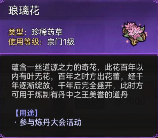 炼丹消耗材料:「琅璃花」,主要获得途径是仙盟商店用仙盟功勋兑换(每周可兑换80个,推荐买满),在灵田和林场中也有概率产出。