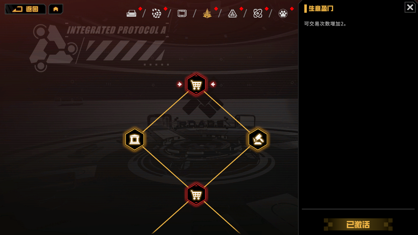 基地科技树(即集成协议系统)分为多个子系统,通过消耗指定资源为游戏多个系统提供加成/进阶功能解锁,可以提升多个系统运行效率。