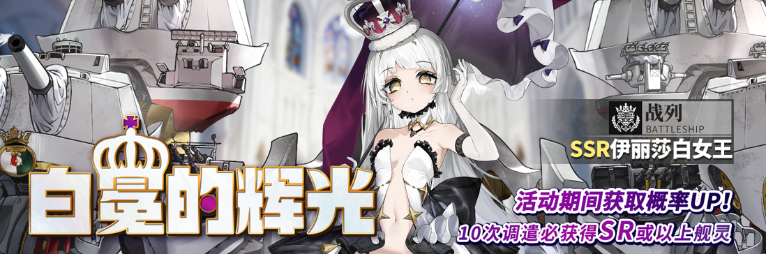 指挥官可通过「紧急调遣证」在「白冕的辉光」活动调遣中获取限定SSR舰灵「伊丽莎白女王」,且该角色的获取概率将在活动期间大幅提升!具体概率将在游戏内公示。